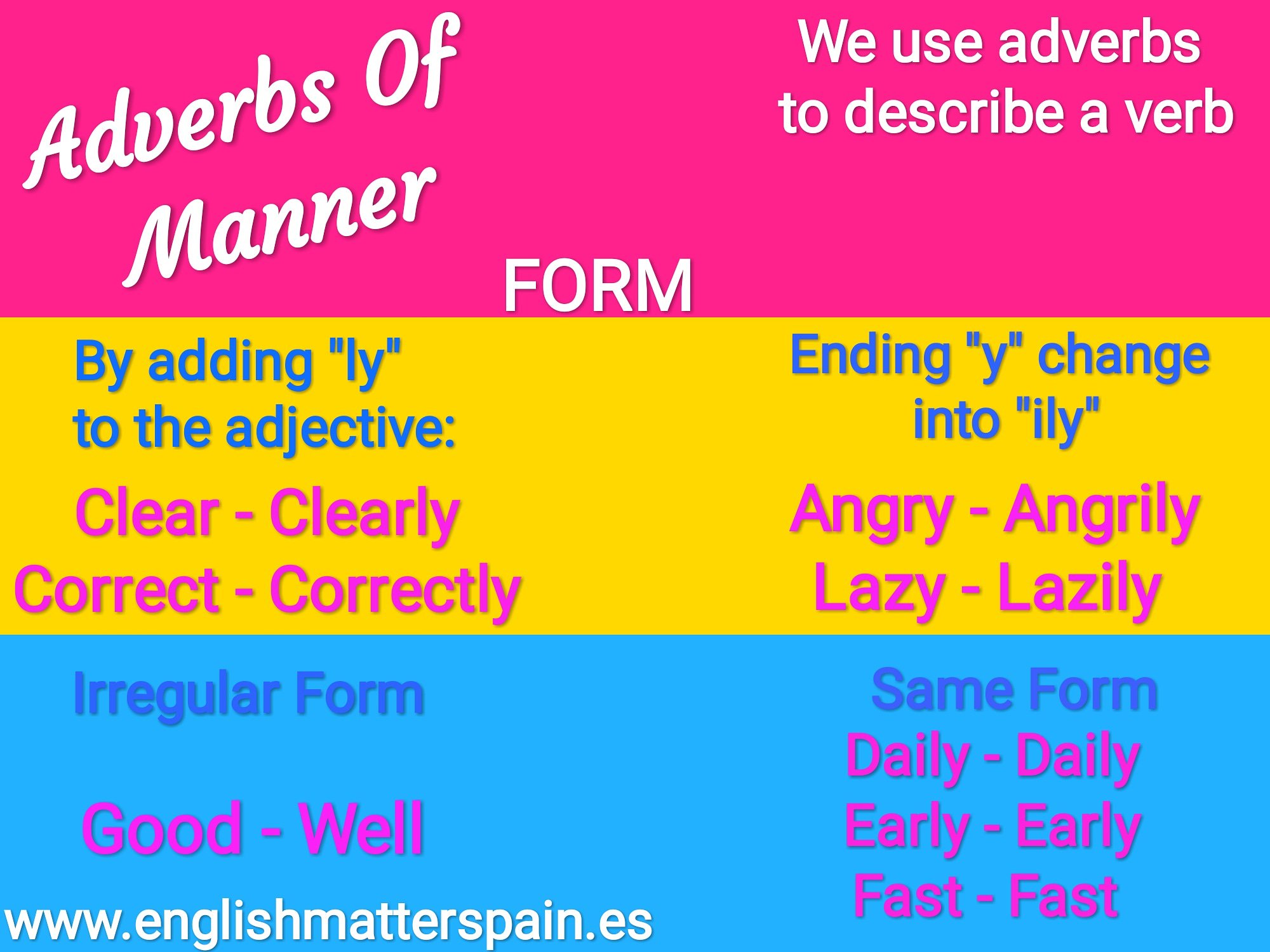Adverbs Of Manner Mingle Ish from mingle-ish.com 50 adverbs of manner (2) 50 adverbs of manner (3) adjectives and adverbs; Adverbs of manner mainly modify verbs and tell us the way in which something happens. Some of them can be used as either adjectives or adverbs. How to use adjectives and adverbs. They can modify verbs, adjectives, or clauses of a sentence. Aug 20, 2010 · adverbs of manner always come after a verb and can be used with words like very or too. This is just a sample, as adverbs of manner actually form the largest of all groups of adverbs. Slow ⇒ slowly).here is a list of irregular adverbs, i.e.